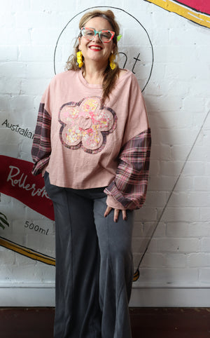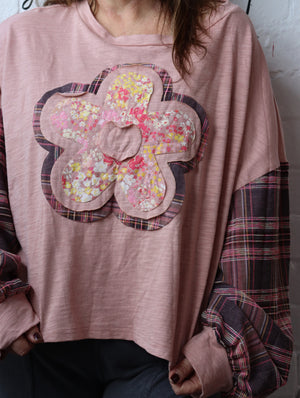 A playful mix of boho charm and retro flair, this relaxed-fit top brings creativity to your everyday wardrobe. The soft blush cotton body features a bold, appliquéd floral design in layered pinks and yellows, finished with contrast plaid balloon sleeves that add a cozy, quirky touch. Effortlessly comfortable and full of personality — perfect for creative days, casual outings, or layering through the seasons.