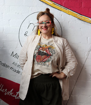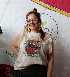 This vintage-inspired tee is full of rock ’n’ roll attitude with a feminine twist. Featuring a bold retro “Scream Department” graphic and detailed lace cap sleeves, it perfectly balances edgy and soft styling. The relaxed fit and lightweight cotton make it effortlessly easy to wear — perfect with wide-leg pants, denim, or layered under a jacket.