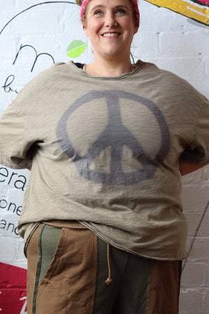 A relaxed, feel-good essential with a vintage soul. This oversized tee features a bold faded peace symbol on soft, lightweight cotton in a warm sandstone hue. With its loose fit, drop shoulders, and raw-edge hem, it’s the perfect blend of comfort and effortless cool — ideal for layering, lounging, or pairing with your favourite pants for a laid-back creative vibe.